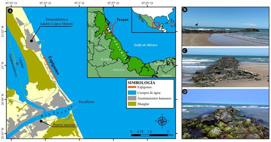 Área de estudio. El municipio de Tuxpan se localiza en el norte del estado de Veracruz, al suroeste del golfo de México, y presenta un litoral arenoso con pendiente suave. Esta localidad tiene relevancia turística y destaca el transito marítimo nacional e internacional, ya que presenta un puerto marítimo industrial y comercial (Fig. 1A). A lo largo de la franja costera se encuentran 35 localidades, siendo Barra Norte, San Antonio y Villamar Chile Frio las comunidades rurales más cercanas a la costa. En la zona turística de playa San Antonio, se localizan 16 espigones construidos en 2016 con roca basáltica, ubicadas dentro de la zona intermareal. Estas estructuras de protección son rectas y cortas (aproximadamente 60 m de longitud), con una cresta emergente y están posicionadas de forma perpendicular al litoral, con una separación promedio de 160 m entre uno y otro espigón (Fig. 1B-D). Los espigones se ubican a lo largo de un tramo de 2 km del litoral de Tuxpan; al norte colindan con la Central Termoeléctrica “Adolfo López Mateos”, mientras que, al sur, a una distancia de 2.46 km se encuentra la desembocadura del rio Tuxpan, la cual posee dos escolleras de aproximadamente 1 km de longitud (López-Portillo et al., 2023).