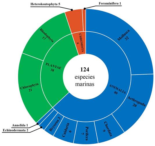 En este estudio se identificaron un total de 124 taxones a nivel de especie, distribuidos en tres reinos y 12 filos. El reino Animal fue el más representativo, con ocho filos y 80 especies, mientras que las algas marinas están representadas por 43 especies, también se registró un Chromista no fotosintético del filo Foraminífera (Fig. 2) identificado como Homotrema rubrum (Fig. 3E). Adicionalmente, se registra por primera vez para la zona norte de Veracruz al poliqueto Phragmatopoma caudata (Fig. 3N), mientras, el hidrozoo Pennaria disticha (Fig. 3F), los briozoos Licornia cf. regularis y Biflustra cf. savartii (Fig. 3E) y el picnógonido Ammothella appendiculata (Fig. 3K), constituyen nuevos registros para el suroeste del golfo de México. Así mismo, se confirma la presencia del coral exótico Oculina patagonica (Fig. 3H) y del bivalvo Electroma vexillum (Fig. 3J) (Tabla I).