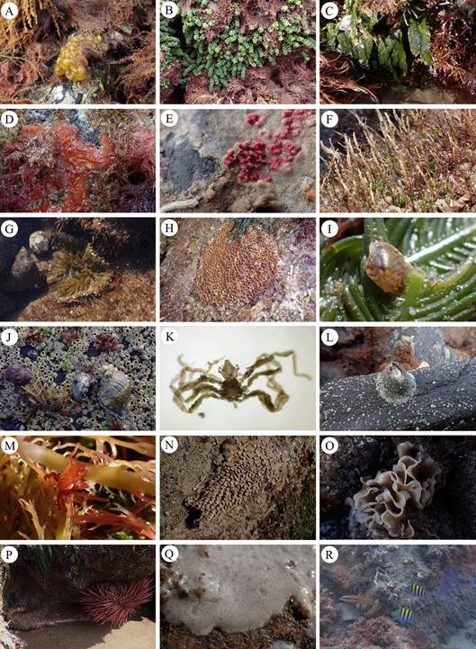 Figura 3. Especies marinas que habitan en los espigones de Tuxpan, Veracruz, México. A, Colpomenia sinuosa; B, Caulerpa racemosa; C, Caulerpa mexicana; D, Placospongia ruetzleri; E, Biflustra cf. savartii (incrustación blanca) y Homotrema rubrum; F, Pennaria disticha; G, Actinostella flosculifera; H, Oculina patagonica; I, Electroma vexillum; J, Stramonita floridana y Chthamalus fragilis; K, Ammothella appendiculata; L, Tetraclita stalactifera; M, Acanthonyx petiverii; N, Phragmatopoma caudata; O, Thalamoporella floridana; P, Holothuria (Halodeima) grisea y Echinometra lucunter; Q, Didemnum sp.; R, Halichoeres bivittatus y Abudefduf saxatilis.