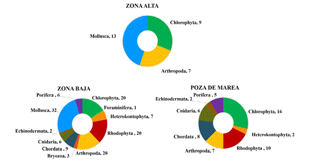 En cuanto a la fauna marina, a nivel de Filo, Mollusca y Arthropoda fueron los grupos más diversos, con 32 y 20 especies respectivamente (Fig. 2). A nivel de Orden, Decapoda fue el más representativo con 13 especies y tres géneros identificados (Tabla II). De igual manera, la distribución vertical de la fauna marina presentó su mayor riqueza en la zona baja con 79 especies, siendo moluscos y artrópodos los más representativos con 33 y 20 especies, respectivamente. En cambio, en las pozas de marea se registraron 28 especies, y en la zona alta solo se identificaron 20 taxones (Fig. 4). Mientras, 18 especies representados por gasterópodos, balanos y crustáceos decápodos fueron comunes de observar en la zona alta y baja de los espigones (Tabla II).